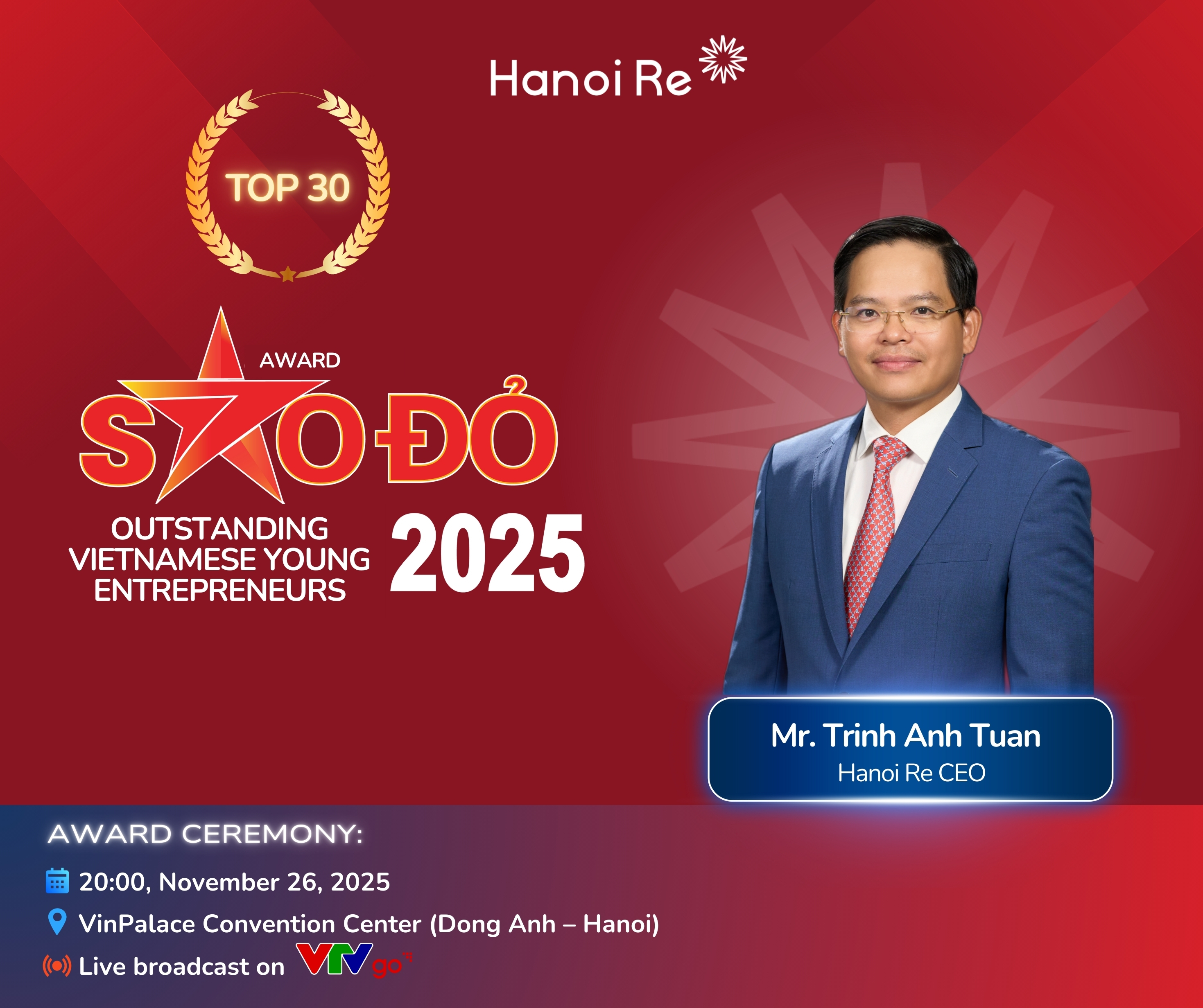 According to the announcement by the Central Committee of the Vietnam Young Entrepreneurs Association, Mr. Trịnh Anh Tuấn, Chief Executive Officer of Hanoi Reinsurance Corporation (Hanoi Re), has been named among the Top 30 Vietnam Outstanding Young Entrepreneurs – Red Star Award 2025.