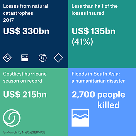 The hurricane trio of Harvey, Irma and Maria will cost the insurance industry a record amount in 2017: the final insurance bill for those and other natural catastrophes, including a severe earthquake in Mexico, is expected to come to US$ 135bn – higher than ever before. And overall losses – i.e. including uninsured losses – amounted to US$ 330bn, the second-highest figure ever recorded for natural disasters. The only costlier year so far was 2011, when the Tohoku earthquake in Japan contributed to overall losses of US$ 354bn in today’s dollars.
