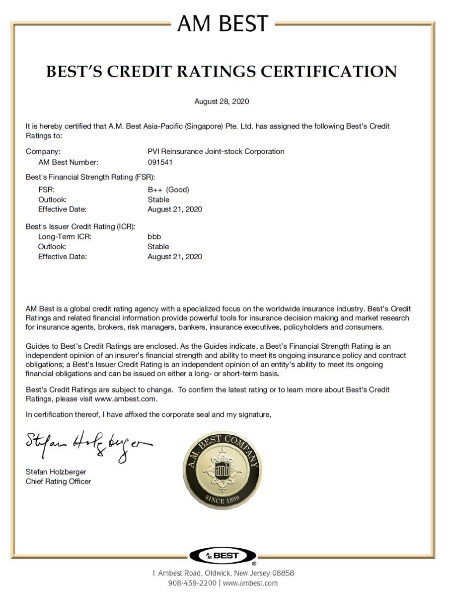 Not only dealing with the Covid -19 pandemic, many insurance companies around the world also have to face a credit rating downgrade as a result of an unprecedented period of business and management like this. Despite such difficulties, PVIRe's operating model has proved effectiveness as on August 21, 2020, the world's leading financial credit rating agency, AMBest, announced to maintain PVIRe's financial capacity rating at B ++ (Good) and the credit capacity of the issuer at “bbb”, the prospects of both indicators remain stable (Stable). B ++ financial capacity credit rating shows that PVIRe's financial strength is rated as good by AMBest, and it also reflects stable business results and sustainable development throughout the years.