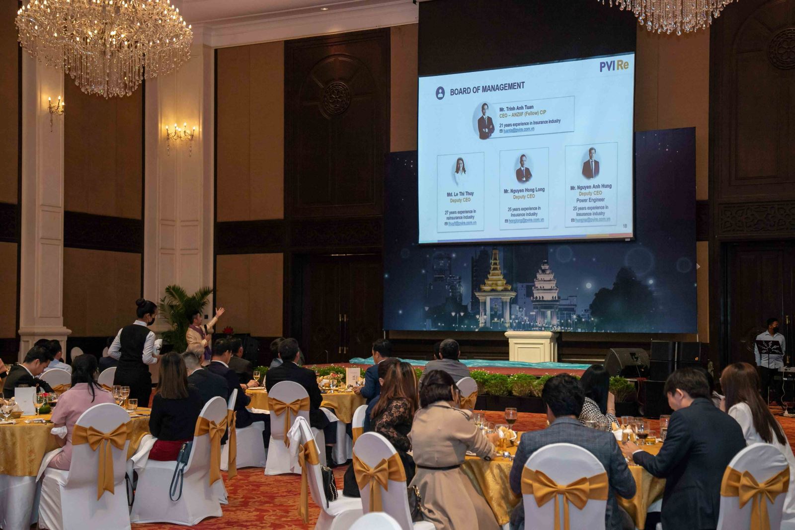 Chương trình Gala Dinner được mở màn với bài phát biểu tri ân trang trọng đến các đối tác, khách hàng tại thị trường Campuchia của Ông Trịnh Anh Tuấn – Tổng giám đốc PVI Re. Cũng trong chương trình, Ông Trần Anh Linh – Trưởng Ban kinh doanh phía Nam và thị trường Campuchia đã trình bày những thông tin cập nhật mới nhất về thị trường tái bảo hiểm quốc tế, xu hướng tổn thất, các yêu cầu của thị trường trong thời gian tới và đặc biệt đưa ra giải pháp cho các vấn đề trong mùa tái tục sắp tới. Tiếp nối chương trình là những tiết mục văn nghệ vô cùng hấp dẫn, sôi động và hết mình đến từ Lãnh đạo và cán bộ của các công ty bảo hiểm/tái bảo hiểm tại thị trường Campuchia.