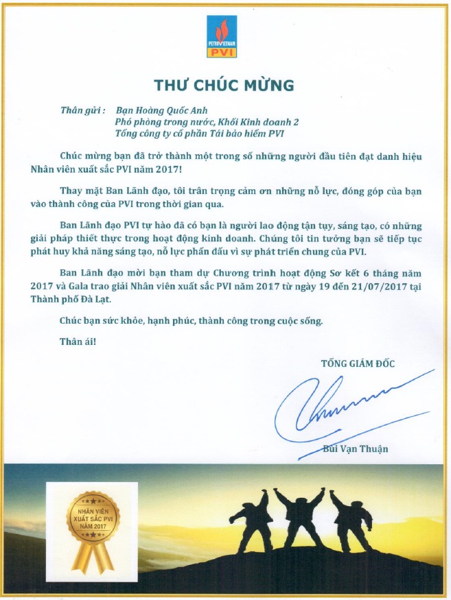 Thư chúc mừng của Tổng giám đốc PVI tới Ông Hoàng Quốc Anh